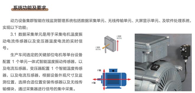 動力設備集群智能在線監(jiān)測系統(tǒng)是通過智能遠程運維系統(tǒng)(RMS)完成工業(yè)生產(chǎn)線的電機、減速機、風機、高低壓變電、泵閥等設備運行狀態(tài)信息及故障信息檢測,通過檢測設備的溫度、震動、轉(zhuǎn)速、電流、電壓等數(shù)據(jù)實時分析處理運行設備狀況,同時通過信息報警推送,智能分析設備運行狀況并實時報警等功能,能迅速找到解決問題的方法。通過在線檢測系統(tǒng)全面實現(xiàn)對關鍵設備的全生命周期管理,提高了設備有效運維時間和效率,降低設備運維成本,降低設備故障時間,減少現(xiàn)場人員維護量,降低維護人員的依賴性。